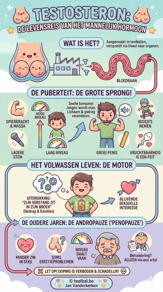 Testosteron is een mannelijk geslachtshormoon dat voornamelijk in de teelballen wordt aangemaakt. Via de bloedbaan verspreidt het zich door het hele lichaam. Verschillende organen reageren op dit hormoon. Als er veel testosteron in het bloed zit, kan het betreffende orgaan sterker of zwakker reageren. Bij kinderen is het testosteronniveau laag, maar tijdens de puberteit stijgt het aanzienlijk.