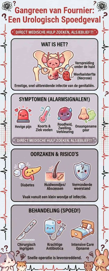 Gangreen van Fournier is zeldzaam, maar extreem gevaarlijk. Levensgevaarlijk! Schaamte is hier de grootste vijand. Heeft u een infectie in de schaamstreek die snel verergert en voelt u zich ziek? Raadpleeg direct een arts. Vroegtijdig ingrijpen redt levens.