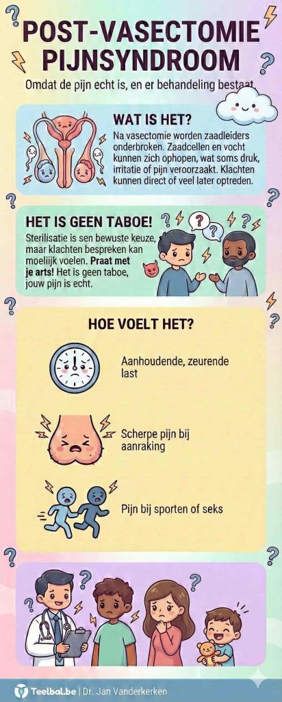 Post-vasectomie pijnsyndroom is aanhoudende pijn in teelbal of bijbal na sterilisatie. Het kan komen door stuwing, cystevorming, (steriele) ontsteking, zenuwirritatie of soms iets anders zoals een liesbreuk. Met gericht onderzoek en een stapsgewijze aanpak is er vaak verbetering mogelijk. Je hoeft er niet alleen mee te blijven rondlopen.