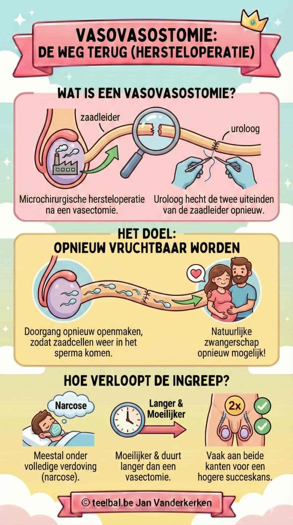 Een vasovasostomie is een microchirurgische hersteloperatie na een vasectomie. De uroloog probeert de twee uiteinden van de zaadleider opnieuw aan elkaar te hechten, zodat zaadcellen weer in het sperma kunnen komen.